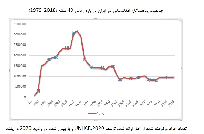 طبق نمودار فوق و دادههای مربوط به تحرک جمعیت افغانستانیهای مهاجر طی 40 سال در ایران، میتوان گفت که بیشترین میزان حضور افغانستانیهای مهاجر مربوط به سال 1991 با جمعیت سه میلیون و صدوهشتادوشش هزار و ششصد و شانزده نفر است. از سال 1981 تا ابتدای سال 1991 شاهد بیشترین میزان مهاجرت از افغانستان به ایران هستیم که این امر به دلیل اشغال افغانستان توسط اتحاد جماهیر شوروی سابق و آغاز جهاد مجاهدین علیه قوای شوروی میباشد، بدین ترتیب جنگ و به دنبال آن ناامنی شدید در افغانستان سبب گردید تا جمعیت زیادی از کشور برای حفظ جان خود به ایران پناه بیاورند. دومین مرحله بین سالهای 1992 تا 2003 میباشد که طی این دوره شاهد کاهش میزان حضور افغانستانیها در ایران و بازگشت آنها به وطن میباشیم که این امر به دلیل سقوط حکومت کمونیستی و پیروزی مجاهدین میباشد، در دوره کوتاه حکومت مجاهدین در اکثر مناطق حکومتهای محلی جهت اداره امور شکل گرفت، گرچه در این مناطق که توسط فرماندهان برجسته قبلی جهاد اداره میشد، جنگ نبود اما زورگویی، اختناق و تجاوز به حریم مردم به حدی رسید که زمینه را برای حضور طالبان مساعد ساخت. جنگ و ناامنی در پایتخت یعنی کابل هم همچنان ادامه داشت.