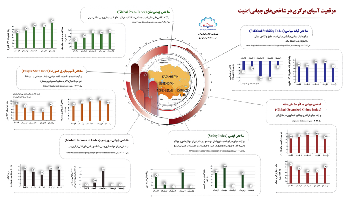 در راستای بررسی موقعیت کشورهای آسیای مرکزی از نظر شاخصهای جهانی امنیت جهت بهرهبرداری پژوهشگران، تحلیلگران و علاقهمندان به مسائل منطقه، کارگروه آسیای مرکزی «مؤسسه مطالعات راهبردی شرق» اقدام به تهیه و انتشار اینفوگرافیک «موقعیت آسیای مرکزی در شاخصهای جهانی امنیت» نموده است. این اینفوگرافیک بر پایه دادههای معتبر بینالمللی شاخصهای «صلح جهانی»، «ثبات سیاسی»، «آسیبپذیری کشورها»، «جرائم سازمانیافته»، «تروریسم»، «ایمنی» را مورد بررسی و مقایسه قرار داده است.