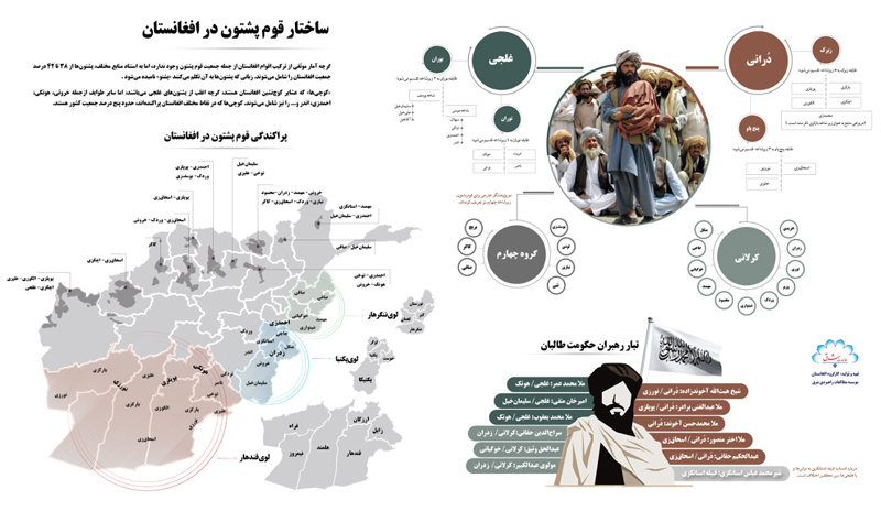همچنین در این اینفوگرافیک، پراکندگی جغرافیایی پشتونها در ولایتهای مختلف افغانستان نشان داده شده است که بیانگر تمرکز جمعیتی و حوزههای نفوذ سنتی این قوم است. این توزیع جغرافیایی بهطور مستقیم بر معادلات امنیتی، سیاسی و قومی افغانستان اثر گذاشته و در بسیاری از تحولات معاصر، از جمله منازعات داخلی و شکلگیری ائتلافهای قدرت، نقش کلیدی ایفا کرده است.