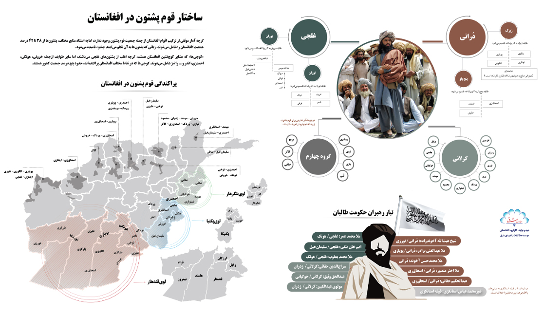 موسسه مطالعات راهبردی شرق به منظور شناخت بهتر ساختار قومی، قبیلهای و جغرافیایی قوم پشتون در افغانستان، اقدام به تهیه اینفوگرافیکی کرده است تا تصویری منسجم از پیچیدگیهای درونی این قوم ارائه دهد. در این اینفوگرافیک، شاخههای اصلی پشتونها، قبایل و طوایف مهم، و پیوندهای خویشاوندی آنها نمایش داده شده است؛ پیوندهایی که نقشی تعیینکننده در شکلگیری روابط اجتماعی، توزیع قدرت و سازوکارهای نفوذ سیاسی در افغانستان داشتهاند.